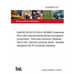 Draft BS EN IEC 61754-6-100/AMD1 Amendment 1 - Fibre optic interconnecting devices and passive components - Fibre optic connector interfaces Part 6-100: Type MU connector family - Simplified receptacle MU-PC connector interfaces