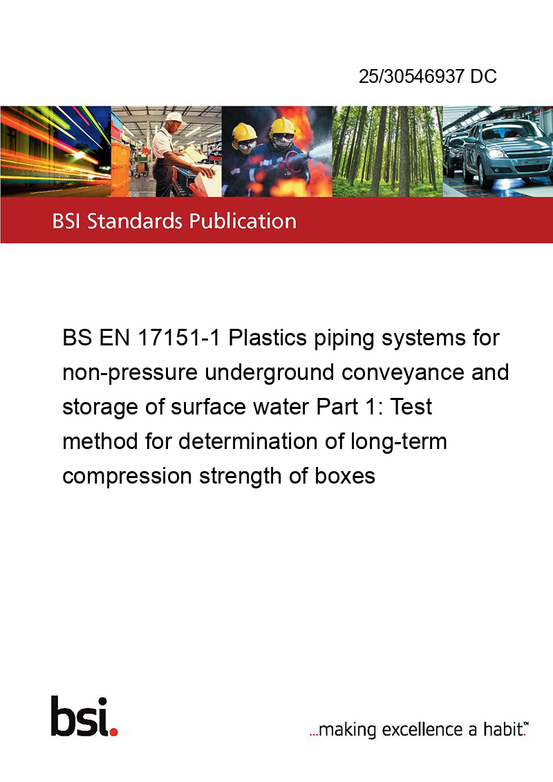 BS EN 17151-1 Plastics piping systems for non-pressure underground conveyance and storage of surface water Part 1: Test method for determination of long-term compression strength of boxes