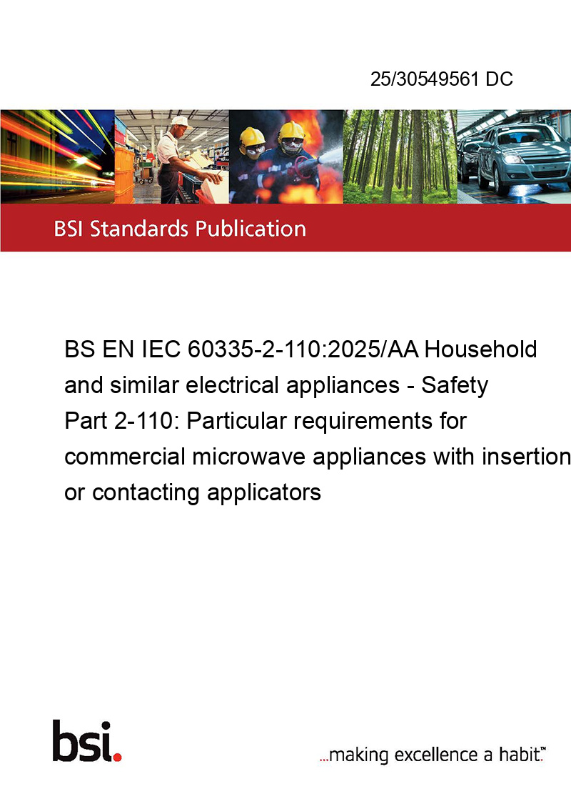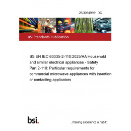 >25/30549561 DC BS EN IEC 60335-2-110:2025/AA Household and similar electrical appliances - Safety Part 2-110: Particular requirements for commercial microwave appliances with insertion or contacting applicators