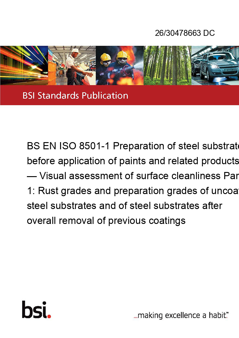 BS EN ISO 8501-1 Preparation of steel substrates before application of paints and related products — Visual assessment of surface cleanliness Part 1: Rust grades and preparation grades of uncoated steel substrates and of steel substrates after overall removal of previous coatings