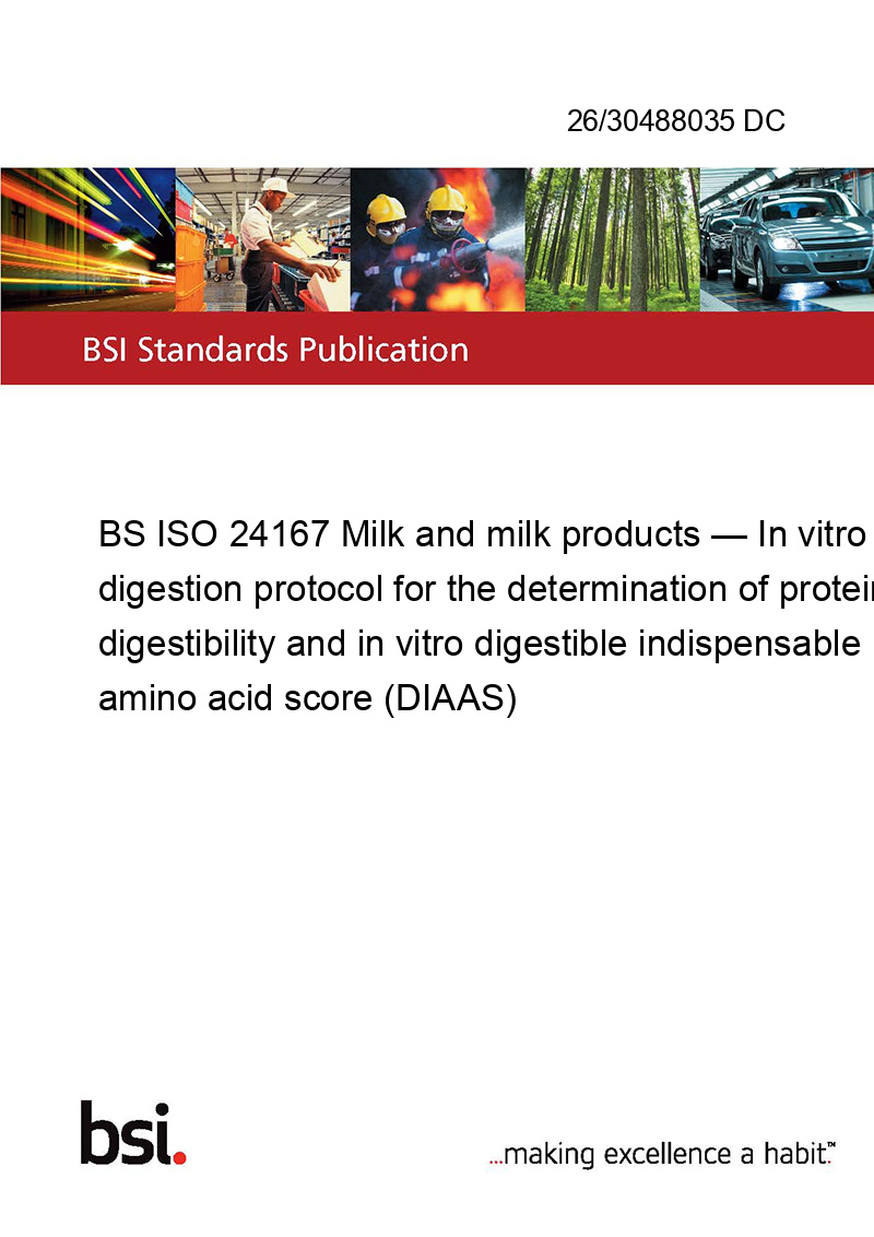 BS ISO 24167 Milk and milk products — In vitro digestion protocol for the determination of protein digestibility and in vitro digestible indispensable amino acid score (DIAAS)
