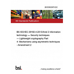 BS ISO/IEC 29192-4:2013/Amd 2 Information technology — Security techniques — Lightweight cryptography Part 4: Mechanisms using asymmetric techniques - Amendment 2