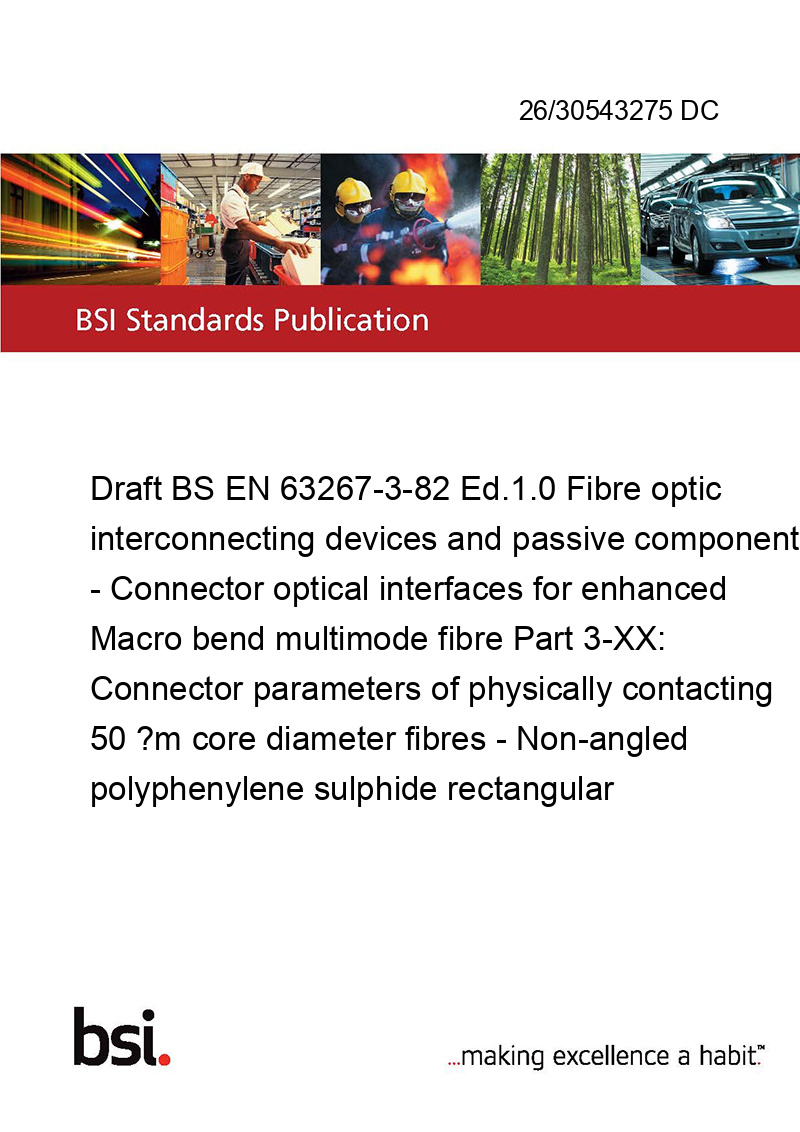 Draft BS EN 63267-3-82 Ed.1.0 Fibre optic interconnecting devices and passive components - Connector optical interfaces for enhanced Macro bend multimode fibre Part 3-XX: Connector parameters of physically contacting 50 ?m core diameter fibres - Non-angled polyphenylene sulphide rectangular