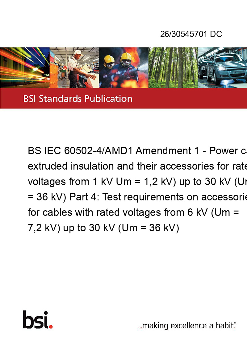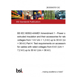 BS IEC 60502-4/AMD1 Amendment 1 - Power cables with extruded insulation and their accessories for rated voltages from 1 kV Um = 1,2 kV) up to 30 kV (Um = 36 kV) Part 4: Test requirements on accessories for cables with rated voltages from 6 kV (Um = 7,2 kV) up to 30 kV (Um = 36 kV)