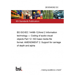 BS ISO/IEC 14496-12/Amd 2 Information technology — Coding of audio-visual objects Part 12: ISO base media file format. AMENDMENT 2: Support for carriage of depth and alpha