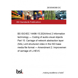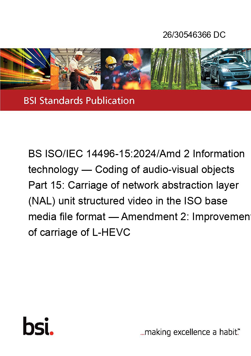BS ISO/IEC 14496-15:2024/Amd 2 Information technology — Coding of audio-visual objects Part 15: Carriage of network abstraction layer (NAL) unit structured video in the ISO base media file format — Amendment 2: Improvement of carriage of L-HEVC