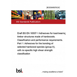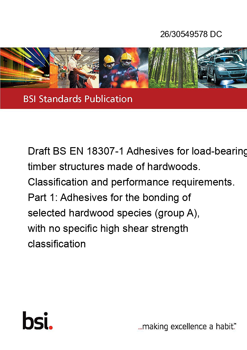 This document establishes a classification for phenolic and aminoplastic polycondensation adhesives classified according to EN 301, one component polyurethane adhesives classified according to EN 15425 and emulsion polymer isocyanate adhesives classified according to EN 16254, according to their suitability for use for load-bearing timber structures made of selected hardwood species (group A) in defined climatic exposure conditions; it specifies performance requirements for such adhesives for the factory manufacture or factory-like manufacturing conditions of load-bearing timber structures made of selected hardwood species only, with no specific high shear strength classification. NOTE An adhesive with high shear strength classification is needed when the declared characteristic shear strength of the glued laminated product is above 3,5 N/mm2, which is the declared characteristic shear strength of glulam made of softwoods according to EN 14080:2013 Table 4. See prEN 18307-3 requirements in this case. It also classifies aminoplastic adhesive systems being used with a range of hardener dosage, and one component polyurethane adhesive product lines where all the products within the line have the same chemical composition except for a different amount of catalyst. This document only specifies the performance of an adhesive for use in an environment corresponding to the defined conditions. The performance requirements of this document are applicable to the adhesive only, not to the manufacturing timber products. This document does not cover the performance of adhesives for on-site gluing (except for factory-like conditions) nor the production of wood-based panels, except solid wood panels, or modified and stabilized wood with considerably reduced swelling and shrinkage properties, e.g. such as acetylated wood, heat treated wood and polymer impregnated wood. It also does not cover preservative treated wood. This document is primarily intended for use by adhesive manufacturers and for use in timber products made of selected hardwood species bonded with adhesives, to assess or control the quality of adhesives. The requirements apply to the type testing of the adhesives. Production control activities are outside the scope of this document. Adhesives meeting the requirements of this document are adequate for use in a load-bearing timber products made of selected hardwood species, provided that the bonding process has been carried out according to an appropriate product standard. Selected hardwood species covered by this document are listed in FprCEN/TS XXX , group A. FprCEN/TS XXX also specifies nominal physical properties of the mentioned species that are used for testing according to this document.