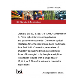 Draft BS EN IEC 63267-3-81/AMD1 Amendment 1 - Fibre optic interconnecting devices and passive components - Connector optical interfaces for enhanced macro bend multimode fibre Part 3-81: Connector parameters of physically contacting 50 μm core diameter fibres - Non-angled polyphenylene sulphide rectangular ferrules with a single row of 12, 8, 4, or 2 fibres for reference connector applications
