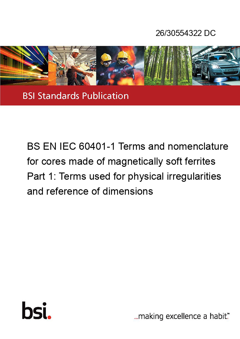 BS EN IEC 60401-1 Terms and nomenclature for cores made of magnetically soft ferrites Part 1: Terms used for physical irregularities and reference of dimensions