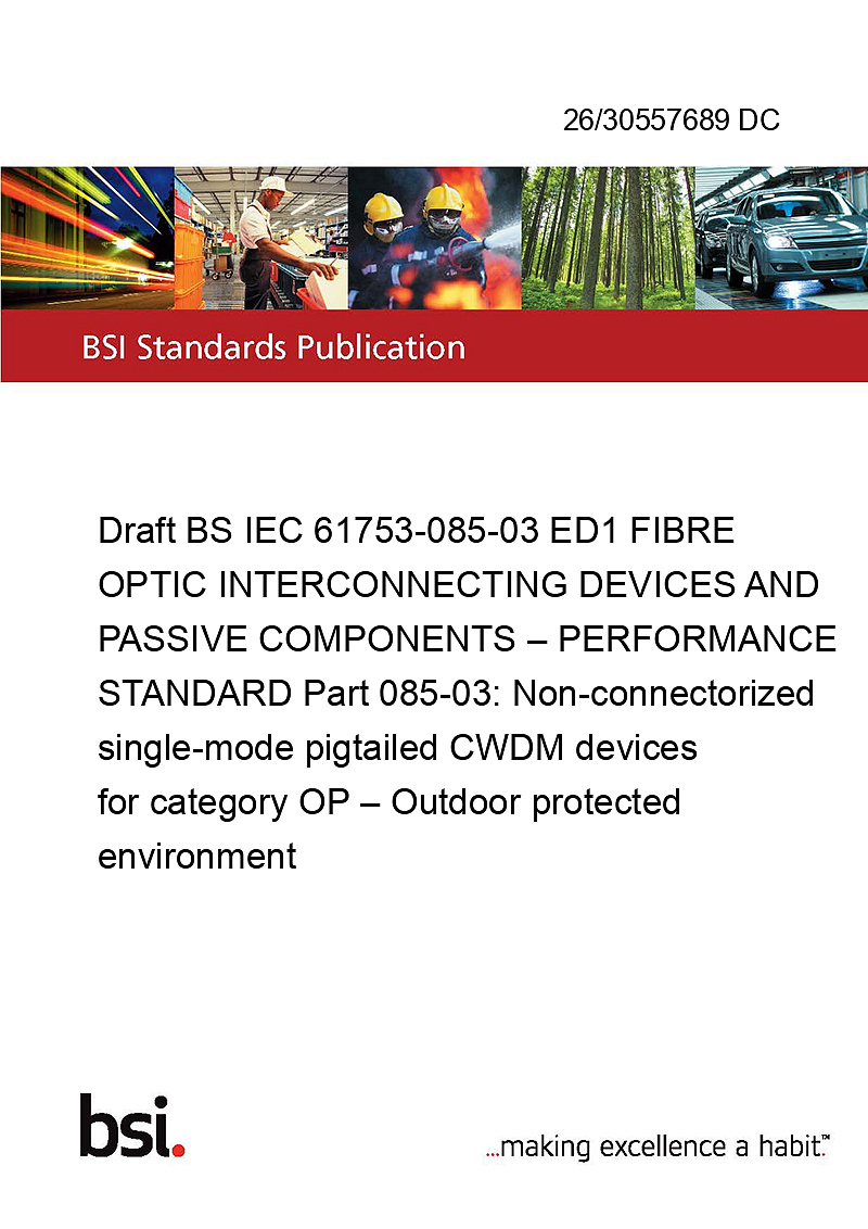 Draft BS IEC 61753-085-03 ED1 FIBRE OPTIC INTERCONNECTING DEVICES AND PASSIVE COMPONENTS – PERFORMANCE STANDARD Part 085-03: Non-connectorized single-mode pigtailed CWDM devices for category OP – Outdoor protected environment