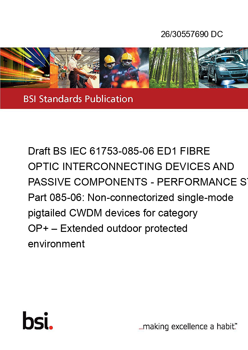 Draft BS IEC 61753-085-06 ED1 FIBRE OPTIC INTERCONNECTING DEVICES AND PASSIVE COMPONENTS - PERFORMANCE STANDARD Part 085-06: Non-connectorized single-mode pigtailed CWDM devices for category OP+ – Extended outdoor protected environment