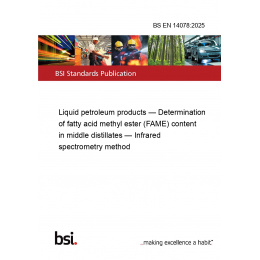 BS EN 14078:2025 je standard, který se zaměřuje na stanovení obsahu FAME v kapalných ropných produktech, konkrétně ve středních destilátech. Tato norma využívá pokročilou metodu infračervené spektrometrie, která umožňuje přesné a spolehlivé měření. Díky tomu je možné zajistit, že produkty splňují požadované specifikace a normy kvality.