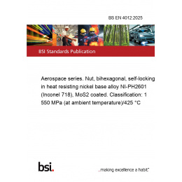 This standard BS EN 4012:2025 Aerospace series. Nut, bihexagonal, self-locking, in heat resisting nickel base alloy NI-PH2601 (Inconel 718), MoS2 coated. Classification: 1 550 MPa (at ambient temperature)/425 °C is classified in these ICS categories: