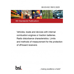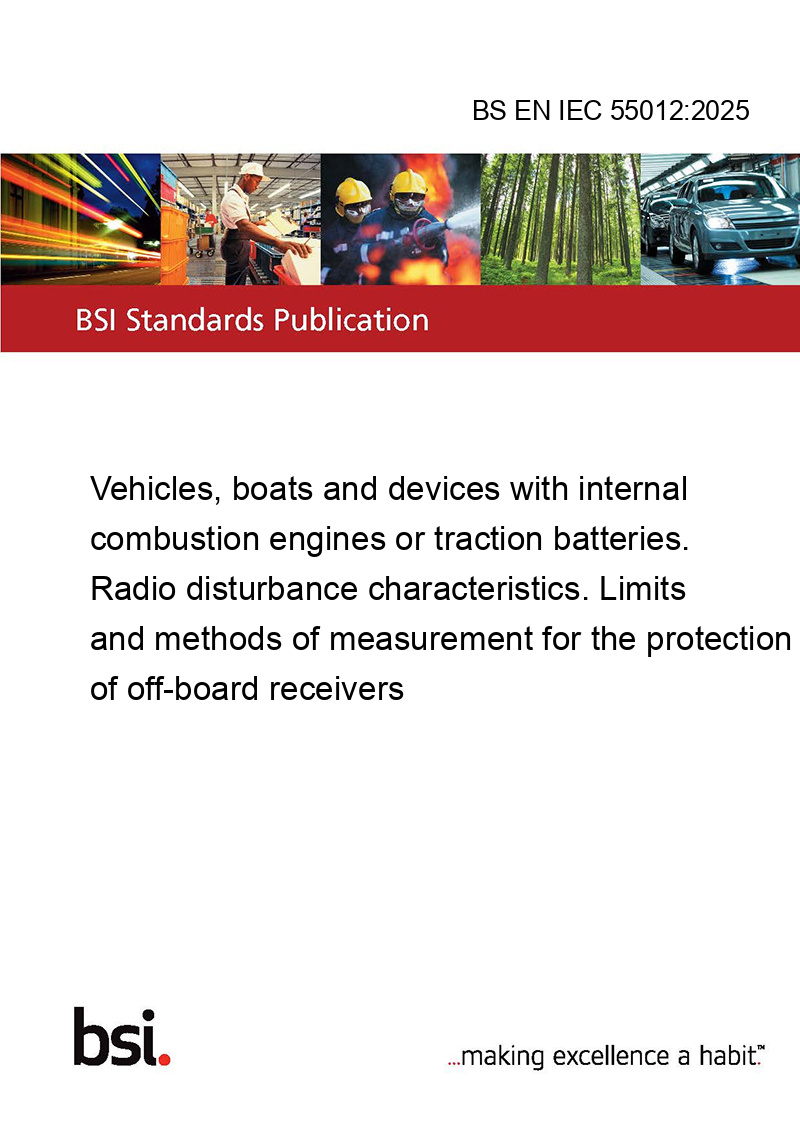 This standard BS EN IEC 55012:2025 Vehicles, boats and devices with internal combustion engines or traction batteries. Radio disturbance characteristics. Limits and methods of measurement for the protection of off-board receivers is classified in these ICS categories:
