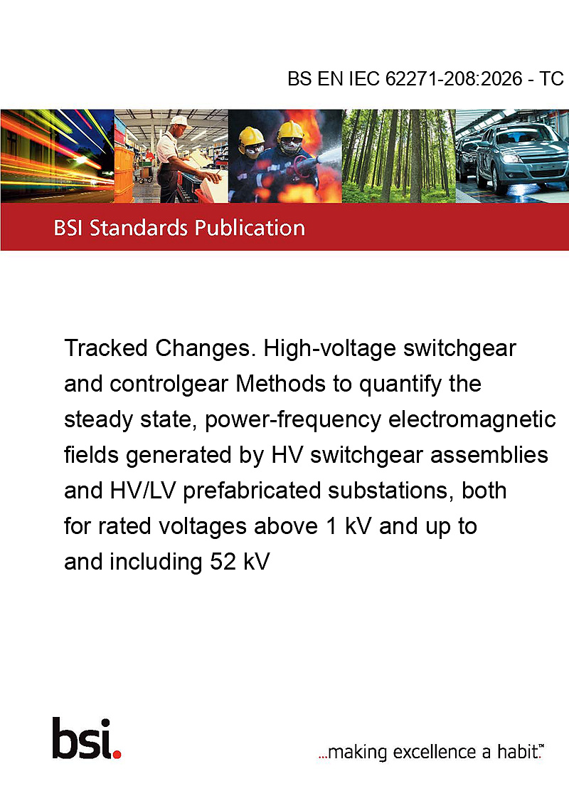 >BS EN IEC 62271-208:2026 - TC Tracked Changes. High-voltage switchgear and controlgear Methods to quantify the steady state, power-frequency electromagnetic fields generated by HV switchgear assemblies and HV/LV prefabricated substations, both for rated voltages above 1 kV and up to and including 52 kV