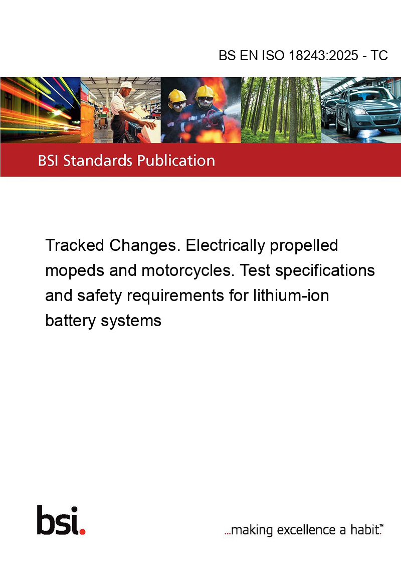 This standard BS EN ISO 18243:2025 - TC Tracked Changes. Electrically propelled mopeds and motorcycles. Test specifications and safety requirements for lithium-ion battery systems is classified in these ICS categories: