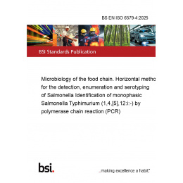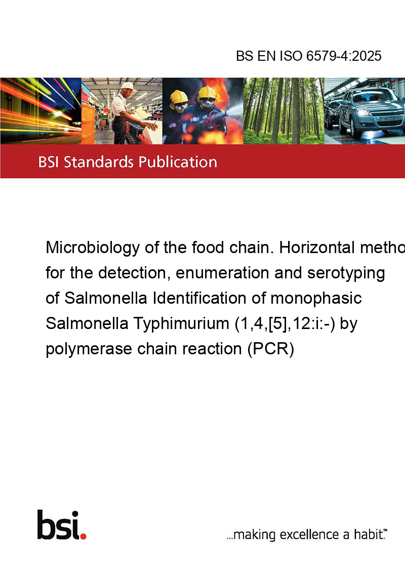 >BS EN ISO 6579-4:2025 Microbiology of the food chain. Horizontal method for the detection, enumeration and serotyping of Salmonella Identification of monophasic Salmonella Typhimurium (1,4,[5],12:i:-) by polymerase chain reaction (PCR)
