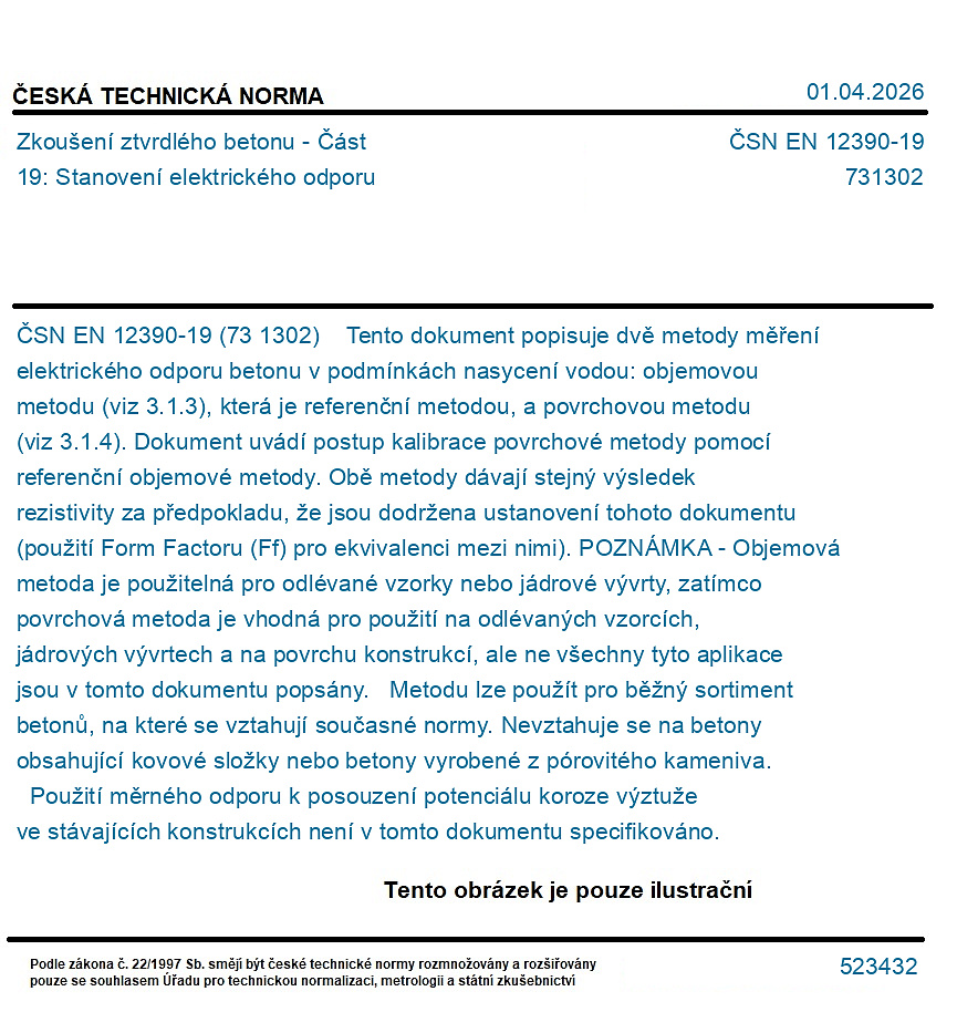 (73 1302) Tento dokument popisuje dvě metody měření elektrického odporu betonu v podmínkách nasycení vodou: objemovou metodu (viz 3.1.3), která je referenční metodou, a povrchovou metodu (viz 3.1.4). Dokument uvádí postup kalibrace povrchové metody pomocí referenční objemové metody. Obě metody dávají stejný výsledek rezistivity za předpokladu, že jsou dodržena ustanovení tohoto dokumentu (použití Form Factoru (Ff) pro ekvivalenci mezi nimi). POZNÁMKA - Objemová metoda je použitelná pro odlévané vzorky nebo jádrové vývrty, zatímco povrchová metoda je vhodná pro použití na odlévaných vzorcích, jádrových vývrtech a na povrchu konstrukcí, ale ne všechny tyto aplikace jsou v tomto dokumentu popsány. Metodu lze použít pro běžný sortiment betonů, na které se vztahují současné normy. Nevztahuje se na betony obsahující kovové složky nebo betony vyrobené z pórovitého kameniva. Použití měrného odporu k posouzení potenciálu koroze výztuže ve stávajících konstrukcích není v tomto dokumentu specifikováno. Tento dokument se nezabývá použitím měrného odporu pro testování betonu z jádrových vývrtů odebraných ze stávající konstrukce, které vyžadují předběžnou úpravu nasycením vodou.