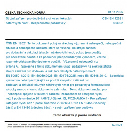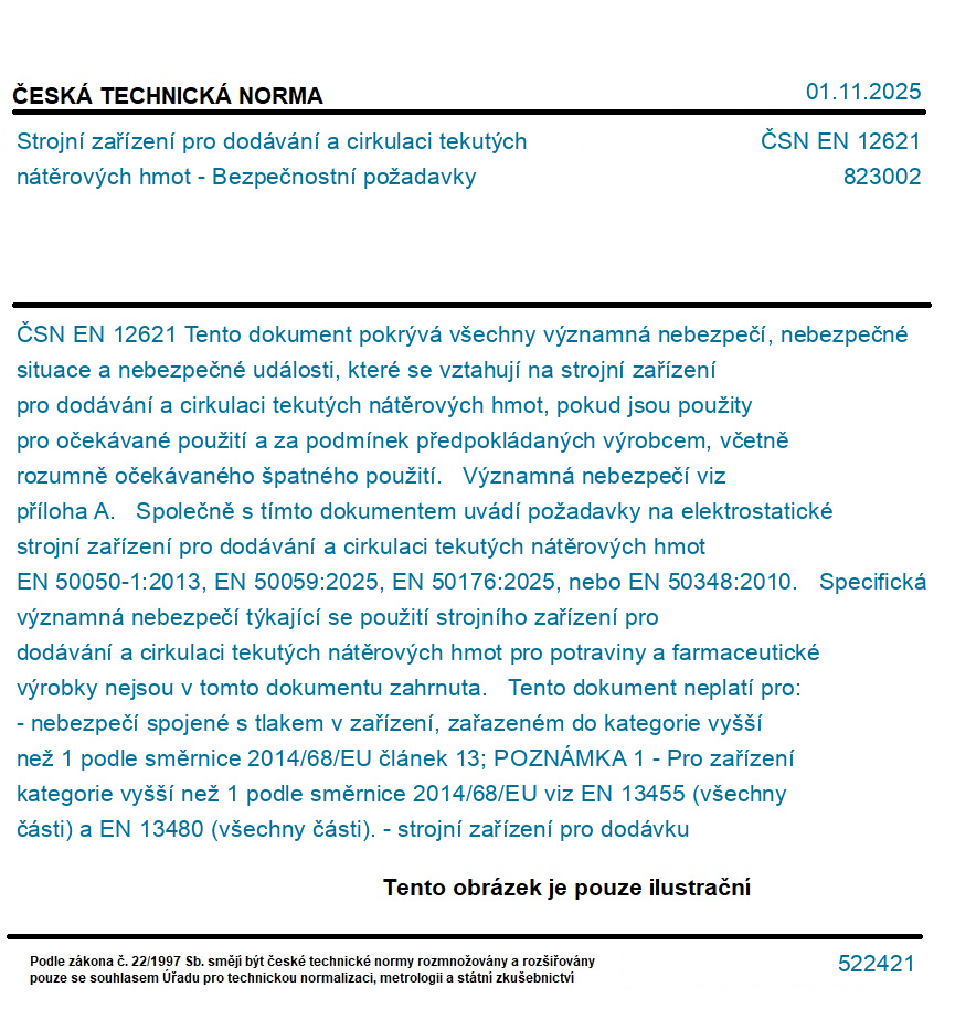 Tento dokument pokrývá všechny významná nebezpečí, nebezpečné situace a nebezpečné události, které se vztahují na strojní zařízení pro dodávání a cirkulaci tekutých nátěrových hmot, pokud jsou použity pro očekávané použití a za podmínek předpokládaných výrobcem, včetně rozumně očekávaného špatného použití. Významná nebezpečí viz příloha A. Společně s tímto dokumentem uvádí požadavky na elektrostatické strojní zařízení pro dodávání a cirkulaci tekutých nátěrových hmot EN 50050-1:2013, EN 50059:2025, EN 50176:2025, nebo EN 50348:2010. Specifická významná nebezpečí týkající se použití strojního zařízení pro dodávání a cirkulaci tekutých nátěrových hmot pro potraviny a farmaceutické výrobky nejsou v tomto dokumentu zahrnuta. Tento dokument neplatí pro: - nebezpečí spojené s tlakem v zařízení, zařazeném do kategorie vyšší než 1 podle směrnice 2014/68/EU článek 13; POZNÁMKA 1 - Pro zařízení kategorie vyšší než 1 podle směrnice 2014/68/EU viz EN 13455 (všechny části) a EN 13480 (všechny části). - strojní zařízení pro dodávku práškových nátěrových hmot; - strojní zařízení pro recyklaci nátěrové hmoty; - ruční míchadla; - míchadla o elektrickém výkonu vyšší než 3 kW; - dodávkové systémy pro CO2 tryskací strojní zařízení; - zařízení použitá pro výrobu nátěrové hmoty; - jednotky pro balení nátěrové hmoty (sudy, kontejnery, atd.). Tento dokument není použitelný pro strojní zařízení pro dodávku a cirkulaci nátěrových hmot vyrobené před datem publikace tohoto dokumentu.