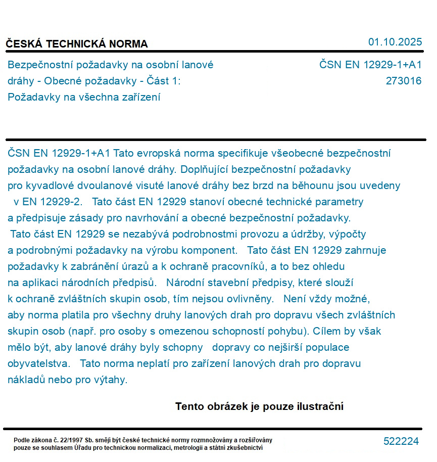 Tato evropská norma specifikuje všeobecné bezpečnostní požadavky na osobní lanové dráhy. Doplňující bezpečnostní požadavky pro kyvadlové dvoulanové visuté lanové dráhy bez brzd na běhounu jsou uvedeny v EN 12929-2. Tato část EN 12929 stanoví obecné technické parametry a předpisuje zásady pro navrhování a obecné bezpečnostní požadavky. Tato část EN 12929 se nezabývá podrobnostmi provozu a údržby, výpočty a podrobnými požadavky na výrobu komponent. Tato část EN 12929 zahrnuje požadavky k zabránění úrazů a k ochraně pracovníků, a to bez ohledu na aplikaci národních předpisů. Národní stavební předpisy, které slouží k ochraně zvláštních skupin osob, tím nejsou ovlivněny. Není vždy možné, aby norma platila pro všechny druhy lanových drah pro dopravu všech zvláštních skupin osob (např. pro osoby s omezenou schopností pohybu). Cílem by však mělo být, aby lanové dráhy byly schopny dopravy co nejširší populace obyvatelstva. Tato norma neplatí pro zařízení lanových drah pro dopravu nákladů nebo pro výtahy.