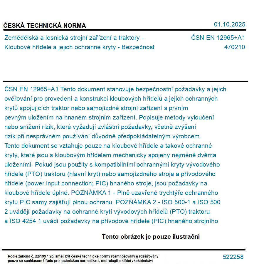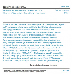 Tento dokument stanovuje bezpečnostní požadavky a jejich ověřování pro provedení a konstrukci kloubových hřídelů a jejich ochranných krytů spojujících traktor nebo samojízdné strojní zařízení s prvním pevným uložením na hnaném strojním zařízení. Popisuje metody vyloučení nebo snížení rizik, které vyžadují zvláštní požadavky, včetně zvýšení rizik při nesprávném používání důvodně předpokládatelným výrobcem. Tento dokument se vztahuje pouze na kloubové hřídele a takové ochranné kryty, které jsou s kloubovým hřídelem mechanicky spojeny nejméně dvěma uloženími. Pokud jsou použity s kompatibilními ochrannými kryty vývodového hřídele (PTO) traktoru (hlavní kryt) nebo samojízdného stroje a přívodového hřídele (power input connection; PIC) hnaného stroje, jsou požadavky na kloubové hřídele úplné. POZNÁMKA 1 - Plně uzavřené trychtýře ochranného krytu PIC samy zajišťují plnou ochranu. POZNÁMKA 2 - ISO 500-1 a ISO 500 2 uvádějí požadavky na ochranné krytí vývodových hřídelů (PTO) traktoru a ISO 4254 1 uvádí požadavky na přívodové hřídele (PIC) hnaného strojního zařízení, které jsou kompatibilní s ochranným krytím podle tohoto dokumentu. Kromě toho tento dokument stanovuje ten druh informací o bezpečných pracovních postupech, které poskytuje výrobce. Tento dokument nepojednává o: - ochranných krytech, které zcela zakrývají kloubový hřídel, ale nejsou s ním mechanicky spojeny; - mechanických parametrech kloubových hřídelů, zařízeních zabraňujících zpětnému otáčení a omezovačích krouticího momentu; - obecných nebezpečích, o kterých pojednává EN ISO 4254-1:2015 (viz úvod). Hlediska ochrany životního prostředí nebyla v tomto dokumentu vzata v úvahu. Tento dokument neplatí pro kloubové hřídele a jejich ochranné kryty, které byly vyrobeny před datem vydání tohoto dokumentu CEN.