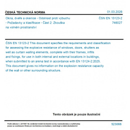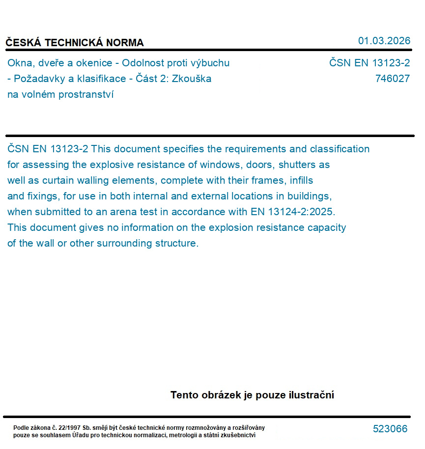 Okna, dveře a okenice - Odolnost proti výbuchu - Požadavky a klasifikace - Část 2: Zkouška na volném prostranství