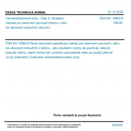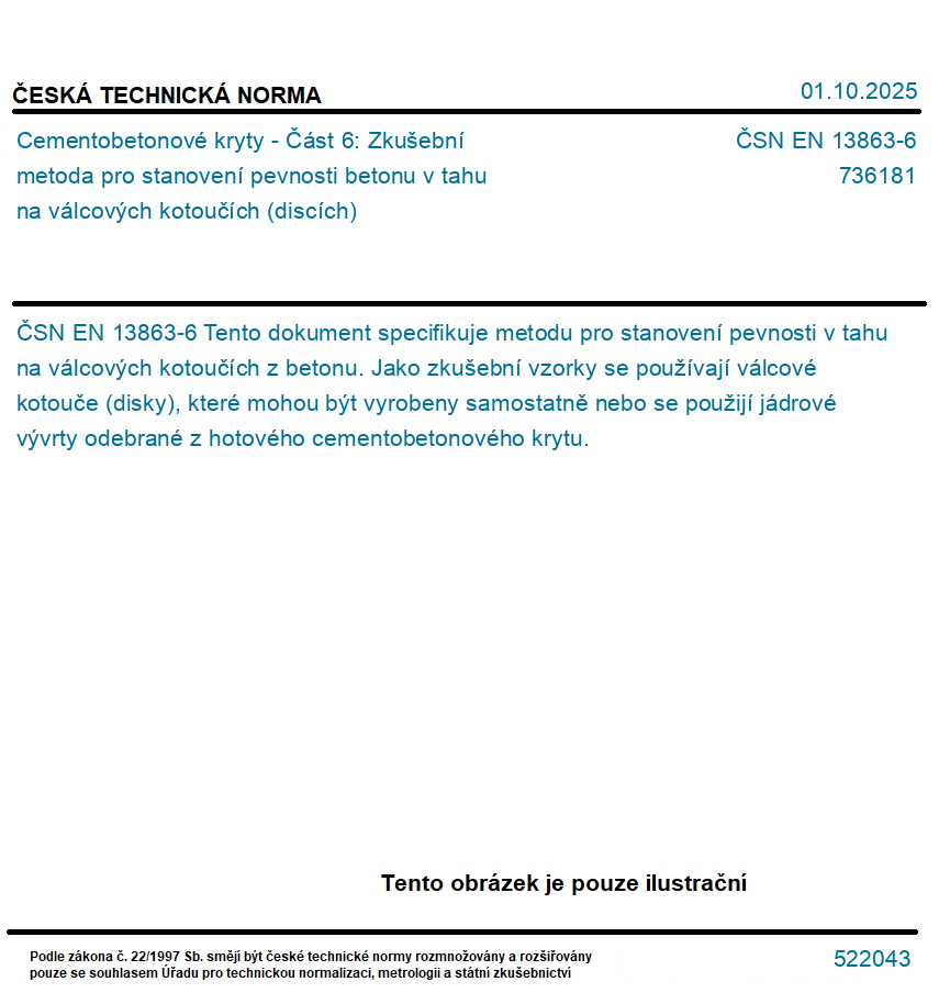 Cementobetonové kryty - Část 6: Zkušební metoda pro stanovení pevnosti betonu v tahu na válcových kotoučích (discích)