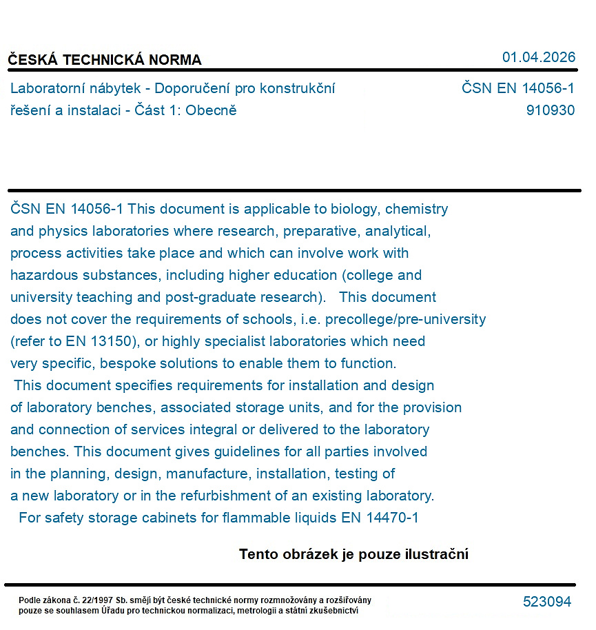 This document is applicable to biology, chemistry and physics laboratories where research, preparative, analytical, process activities take place and which can involve work with hazardous substances, including higher education (college and university teaching and post-graduate research). This document does not cover the requirements of schools, i.e. precollege/pre-university (refer to EN 13150), or highly specialist laboratories which need very specific, bespoke solutions to enable them to function. This document specifies requirements for installation and design of laboratory benches, associated storage units, and for the provision and connection of services integral or delivered to the laboratory benches. This document gives guidelines for all parties involved in the planning, design, manufacture, installation, testing of a new laboratory or in the refurbishment of an existing laboratory. For safety storage cabinets for flammable liquids EN 14470-1 and for pressurized gas cylinders EN 14470-2 applies.