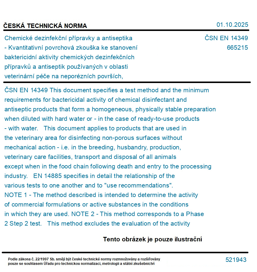 This document specifies a test method and the minimum requirements for bactericidal activity of chemical disinfectant and antiseptic products that form a homogeneous, physically stable preparation when diluted with hard water or - in the case of ready-to-use products - with water. This document applies to products that are used in the veterinary area for disinfecting non-porous surfaces without mechanical action - i.e. in the breeding, husbandry, production, veterinary care facilities, transport and disposal of all animals except when in the food chain following death and entry to the processing industry. EN 14885 specifies in detail the relationship of the various tests to one another and to "use recommendations". NOTE 1 - The method described is intended to determine the activity of commercial formulations or active substances in the conditions in which they are used. NOTE 2 - This method corresponds to a Phase 2 Step 2 test. This method excludes the evaluation of the activity of products against yeasts, fungal spores, mycobacteria and bacterial spores.