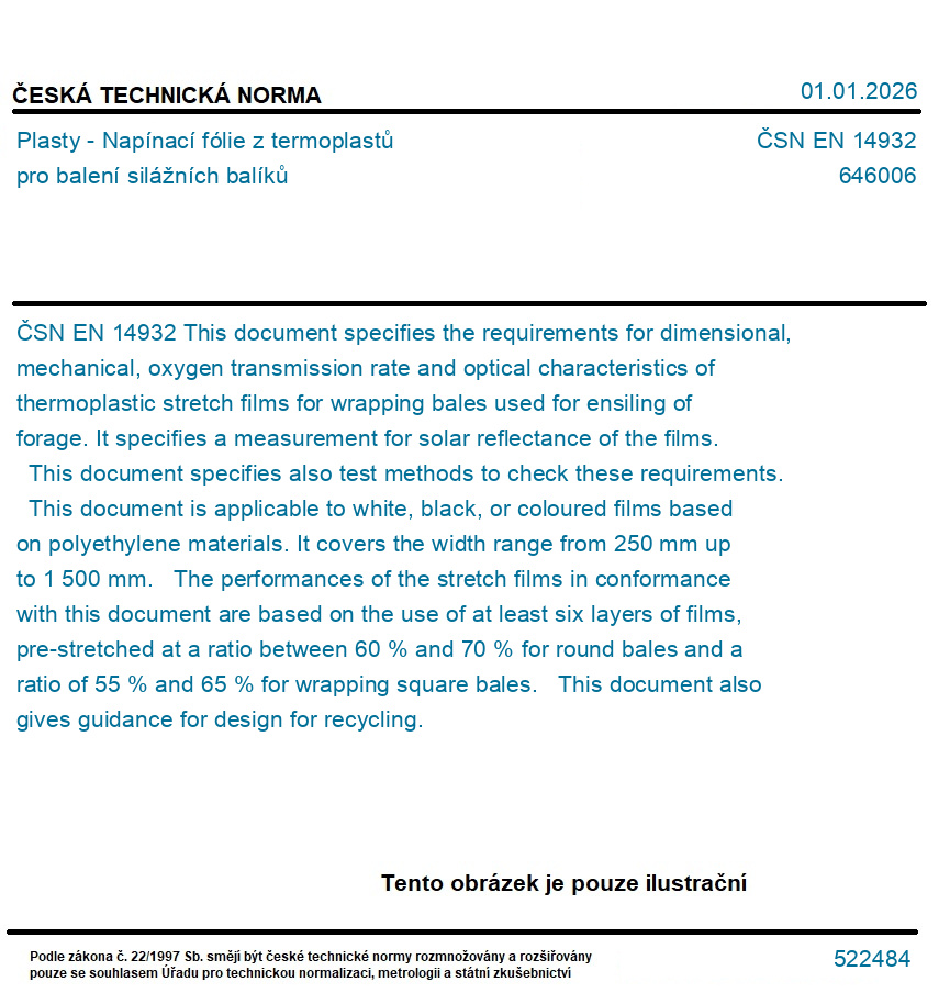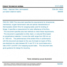 This document specifies the requirements for dimensional, mechanical, oxygen transmission rate and optical characteristics of thermoplastic stretch films for wrapping bales used for ensiling of forage. It specifies a measurement for solar reflectance of the films. This document specifies also test methods to check these requirements. This document is applicable to white, black, or coloured films based on polyethylene materials. It covers the width range from 250 mm up to 1 500 mm. The performances of the stretch films in conformance with this document are based on the use of at least six layers of films, pre-stretched at a ratio between 60 % and 70 % for round bales and a ratio of 55 % and 65 % for wrapping square bales. This document also gives guidance for design for recycling.