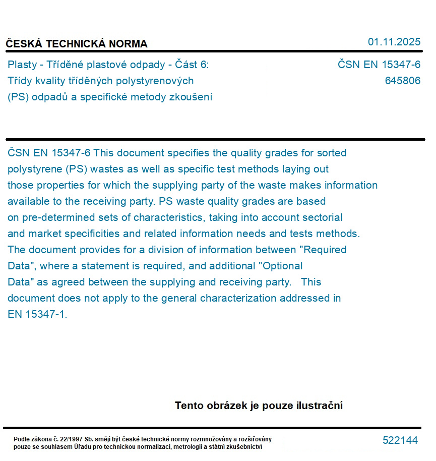 Plasty - Tříděné plastové odpady - Část 6: Třídy kvality tříděných polystyrenových (PS) odpadů a specifické metody zkoušení