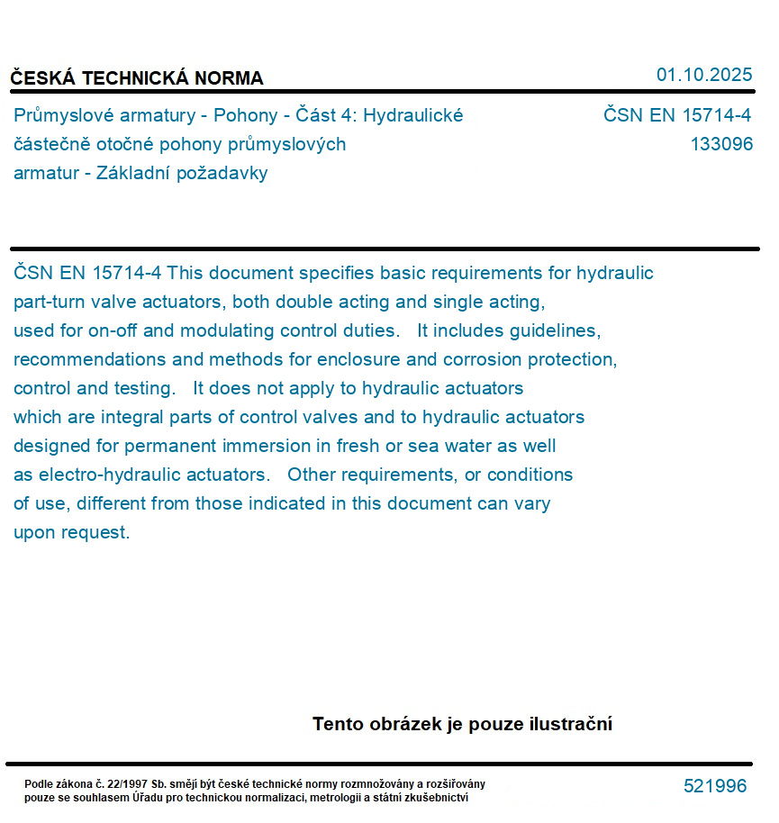 Průmyslové armatury - Pohony - Část 4: Hydraulické částečně otočné pohony průmyslových armatur - Základní požadavky