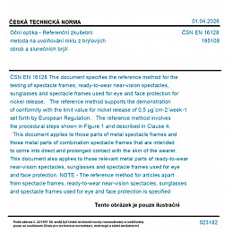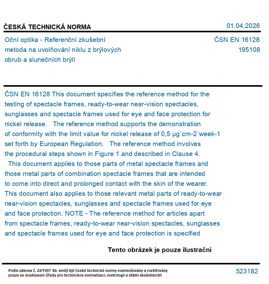 This document specifies the reference method for the testing of spectacle frames, ready-to-wear near-vision spectacles, sunglasses and spectacle frames used for eye and face protection for nickel release. The reference method supports the demonstration of conformity with the limit value for nickel release of 0,5 µg˙cm-2˙week-1 set forth by European Regulation. The reference method involves the procedural steps shown in Figure 1 and described in Clause 4. This document applies to those parts of metal spectacle frames and those metal parts of combination spectacle frames that are intended to come into direct and prolonged contact with the skin of the wearer. This document also applies to those relevant metal parts of ready-to-wear near-vision spectacles, sunglasses and spectacle frames used for eye and face protection. NOTE - The reference method for articles apart from spectacle frames, ready-to-wear near-vision spectacles, sunglasses and spectacle frames used for eye and face protection is specified in EN 1811.