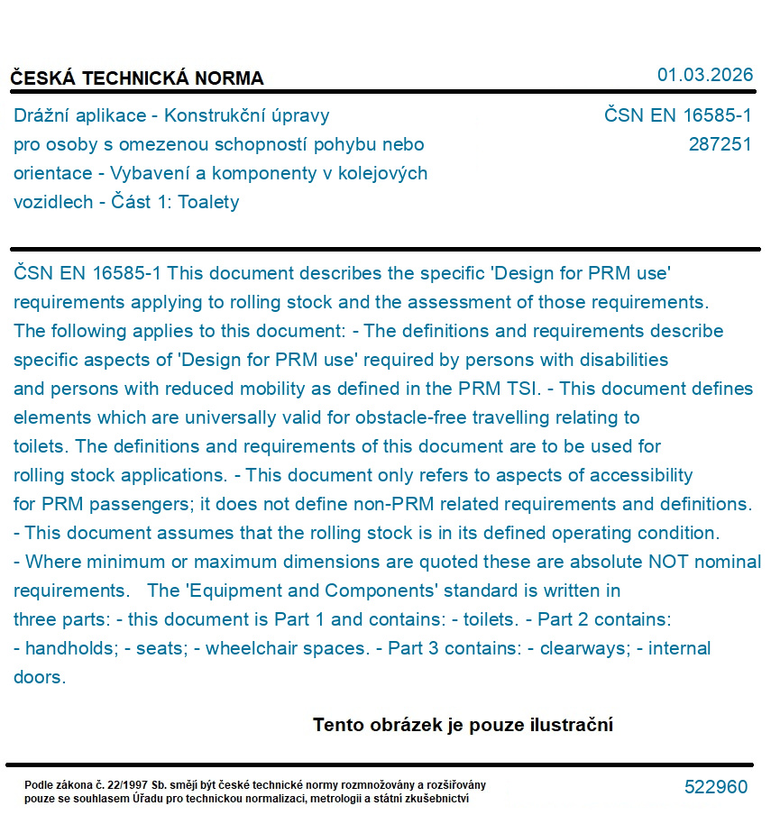 Drážní aplikace - Konstrukční úpravy pro osoby s omezenou schopností pohybu nebo orientace - Vybavení a komponenty v kolejových vozidlech - Část 1: Toalety