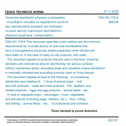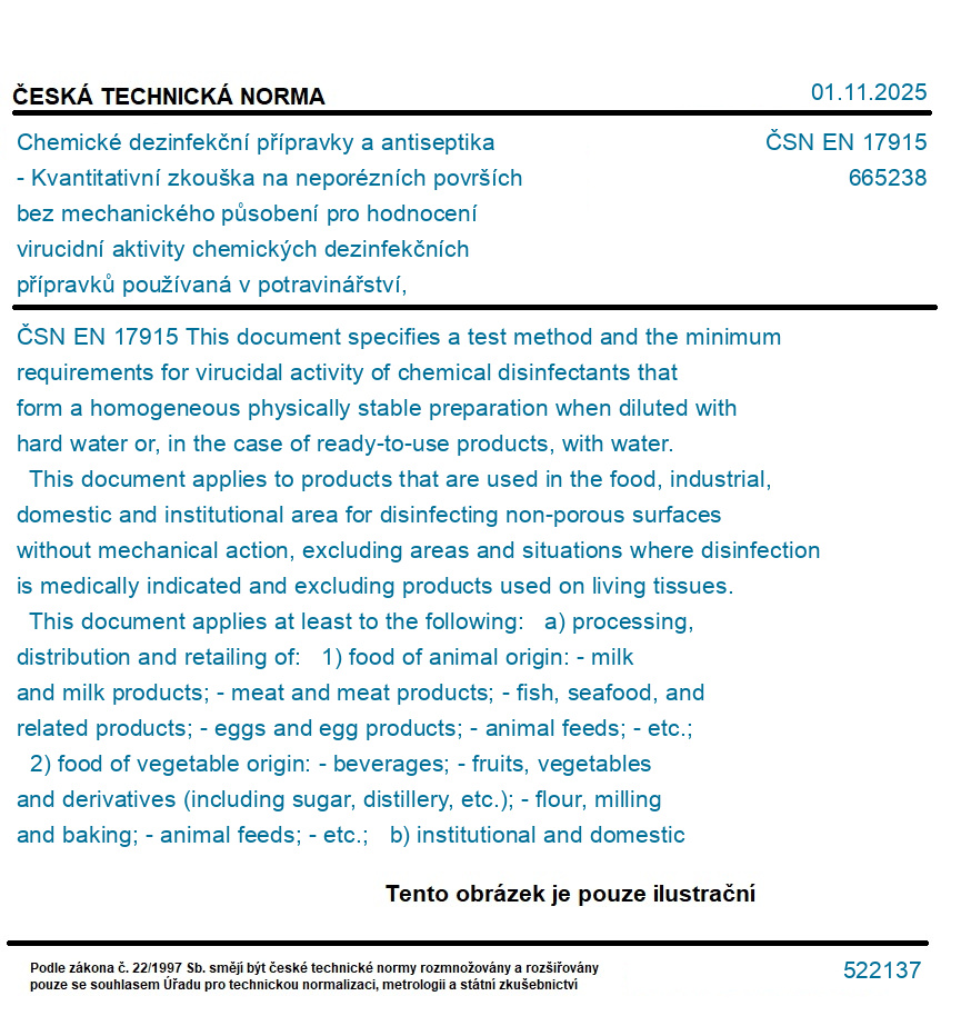 This document specifies a test method and the minimum requirements for virucidal activity of chemical disinfectants that form a homogeneous physically stable preparation when diluted with hard water or, in the case of ready-to-use products, with water. This document applies to products that are used in the food, industrial, domestic and institutional area for disinfecting non-porous surfaces without mechanical action, excluding areas and situations where disinfection is medically indicated and excluding products used on living tissues. This document applies at least to the following: a) processing, distribution and retailing of: 1) food of animal origin: - milk and milk products; - meat and meat products; - fish, seafood, and related products; - eggs and egg products; - animal feeds; - etc.; 2) food of vegetable origin: - beverages; - fruits, vegetables and derivatives (including sugar, distillery, etc.); - flour, milling and baking; - animal feeds; - etc.; b) institutional and domestic areas: - catering establishments; - public areas; - public transports; - schools; - nurseries; - shops; - sports rooms; - waste containers (bins, etc.); - hotels; - dwellings; - clinically non sensitive areas of hospitals; - offices; - etc.; c) industries other than food: - packaging material; - biotechnology (yeast, proteins, enzymes, etc.); - pharmaceutical; - cosmetics and toiletries; - textiles; - space industry, computer industry; - etc.