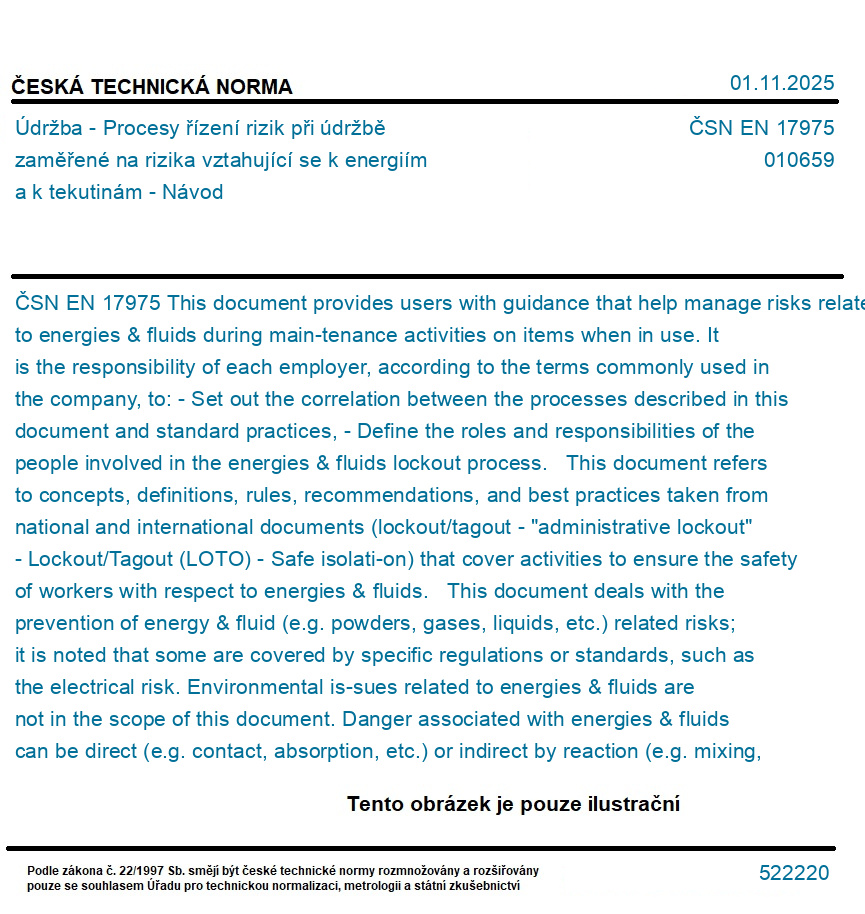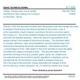 This document provides users with guidance that help manage risks related to energies & fluids during main-tenance activities on items when in use. It is the responsibility of each employer, according to the terms commonly used in the company, to: - Set out the correlation between the processes described in this document and standard practices, - Define the roles and responsibilities of the people involved in the energies & fluids lockout process. This document refers to concepts, definitions, rules, recommendations, and best practices taken from national and international documents (lockout/tagout - "administrative lockout" - Lockout/Tagout (LOTO) - Safe isolati-on) that cover activities to ensure the safety of workers with respect to energies & fluids. This document deals with the prevention of energy & fluid (e.g. powders, gases, liquids, etc.) related risks; it is noted that some are covered by specific regulations or standards, such as the electrical risk. Environmental is-sues related to energies & fluids are not in the scope of this document. Danger associated with energies & fluids can be direct (e.g. contact, absorption, etc.) or indirect by reaction (e.g. mixing, heating, etc.). The scope includes all fluids because they can be intrinsically dangerous or become dangerous. The recommendations given in this document have been drawn up with a view to ensure the safety and health of workers around hazardous energies & fluids, and situations when they are conducting actions related to ma-intenance, settings or changing formats, regardless of the type of activity. The recommendations relate to activities carried out on items. They are applied before, during and after the operation to: - The energies & fluids supplied, contained, transported, or released by items, products, - Risks related to the presence of hazardous energies & fluids for the worker and the surrounding personal. This document is a methodological guideline within the maintenance standards.