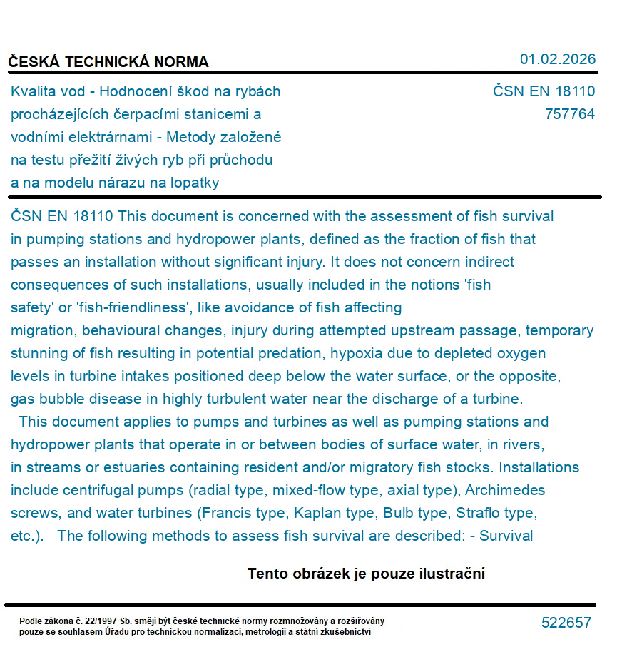This document is concerned with the assessment of fish survival in pumping stations and hydropower plants, defined as the fraction of fish that passes an installation without significant injury. It does not concern indirect consequences of such installations, usually included in the notions 'fish safety' or 'fish-friendliness', like avoidance of fish affecting migration, behavioural changes, injury during attempted upstream passage, temporary stunning of fish resulting in potential predation, hypoxia due to depleted oxygen levels in turbine intakes positioned deep below the water surface, or the opposite, gas bubble disease in highly turbulent water near the discharge of a turbine. This document applies to pumps and turbines as well as pumping stations and hydropower plants that operate in or between bodies of surface water, in rivers, in streams or estuaries containing resident and/or migratory fish stocks. Installations include centrifugal pumps (radial type, mixed-flow type, axial type), Archimedes screws, and water turbines (Francis type, Kaplan type, Bulb type, Straflo type, etc.). The following methods to assess fish survival are described: - Survival tests involving the paired release of live fish, introduced in batches of test and control fish upstream and downstream of an installation, and the subsequent recapture in full-flow collection nets. The method is applicable to survival tests in the field and in a laboratory environment. (Clause 6); - A validated model-based computational method consisting of a blade encounter model and correlations that quantify the biological response to blade strike (Clause 7). The model is applicable to pumping stations and hydropower plants with a low to medium head (<8 m) in which blade strike forms the primary cause of fish damage in most cases. The computational method can be used to scale results from laboratory fish survival tests to full-scale installations operating under different conditions (Clause 8). The survival tests and computational method can also be applied to open-water turbines, with the caveats mentioned in Annex C. The results of a survival test or a computed estimation can be compared with a presumed maximum sustainable mortality rate for a given fish population at the site of a pumping station or hydropower plant. However, this document does not define these maximum rates allowing to label a machine as "fish-friendly", nor does it describe a method for determining such a maximum. This document offers an integrated method to assess fish survival in pumping stations and hydropower plants by fish survival tests and model-based calculations. It allows (non-)government environmental agencies to evaluate the impact on resident and migratory fish stocks in a uniform manner. Thus the document may help to support the preservation of fish populations and reverse the trend of declining migratory fish stocks. Pump and turbine manufacturers will benefit from the document as it sets uniform and clear criteria for fish survival assessment. Further, the physical model that underlies the computational method in the document, may serve as a tool for new product development. To academia and research institutions, this document represents the baseline of shared understanding. It will serve as an incentive for further research in an effort to fill the omissions and to improve on existing assessment methods.