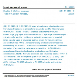 1) EN 1991-1-9 gives principles and rules to determine the values of loads due to atmospheric icing to be used for following types of structures: - masts; - towers; - antennas and antenna structures; - cables, stays, guy ropes and similar structures; - rope ways (cable railways); - structures for ski-lifts; - buildings or parts of them exposed to potential icing; - special types of structures, such as towers for transmission lines and wind turbines. NOTE - Atmospheric icing on electrical overhead lines is covered by EN 50341-1. 2) EN 1991-1-9 specifies values for: - dimensions and weight of accreted ice; - shapes of accreted ice. 3) EN 1991-1-9 covers types of icing, ice loads acting on structures, and falling ice considerations. NOTE - For wind actions on iced structures, see EN 1991-1-4. Assumptions: The assumptions given in EN 1990:2023, 1.2 apply. EN 1991-1-9 is intended to be used with EN 1990 (all parts), the other parts of EN 1991 and EN 1992 (all parts) to EN 1999 (all parts) for the design of structures.