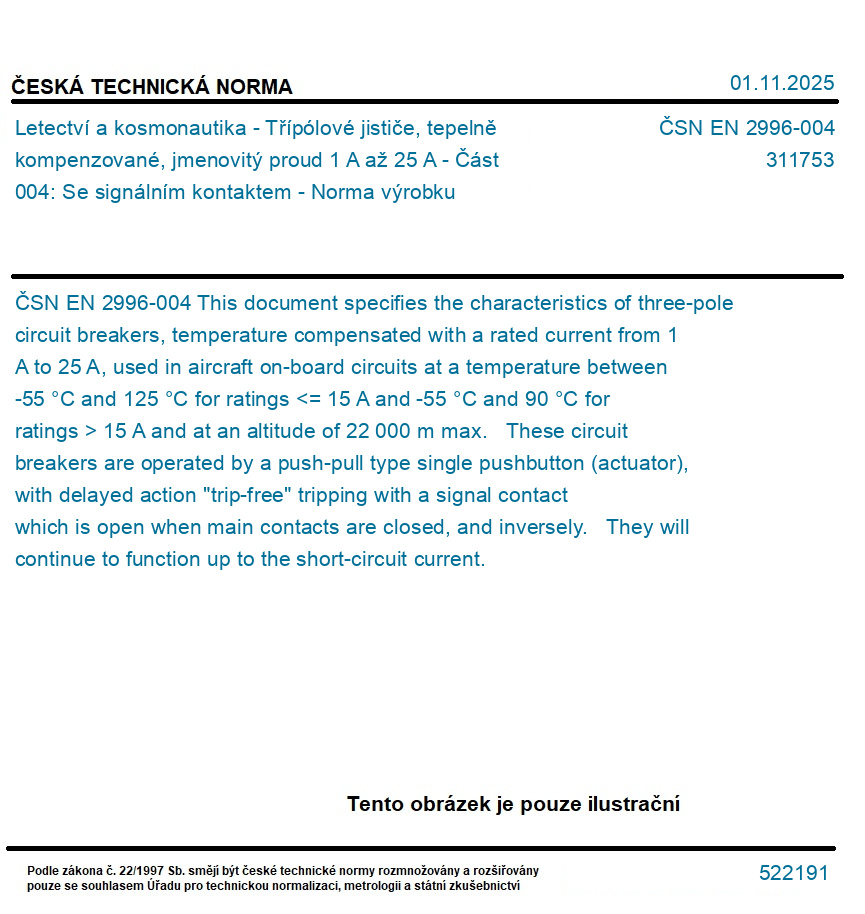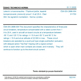 Letectví a kosmonautika - Třípólové jističe, tepelně kompenzované, jmenovitý proud 1 A až 25 A - Část 004: Se signálním kontaktem - Norma výrobku