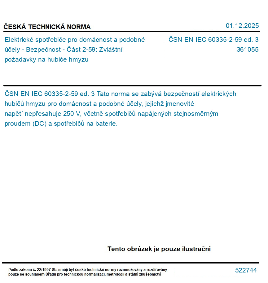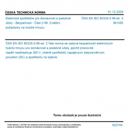 >ČSN EN IEC 60335-2-59 ed. 3 - Elektrické spotřebiče pro domácnost a podobné účely - Bezpečnost - Část 2-59: Zvláštní požadavky na hubiče hmyzu