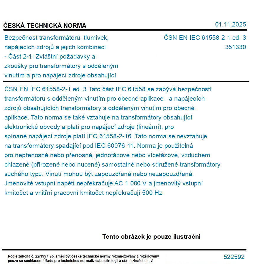 | Označení normy: | ČSN EN IEC 61558-2-1 ed. 3 |