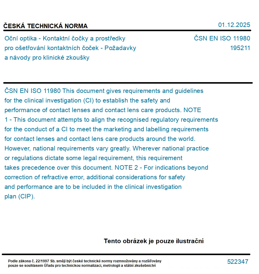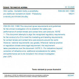 >ČSN EN ISO 11980 - Oční optika - Kontaktní čočky a prostředky pro ošetřování kontaktních čoček - Požadavky a návody pro klinické zkoušky