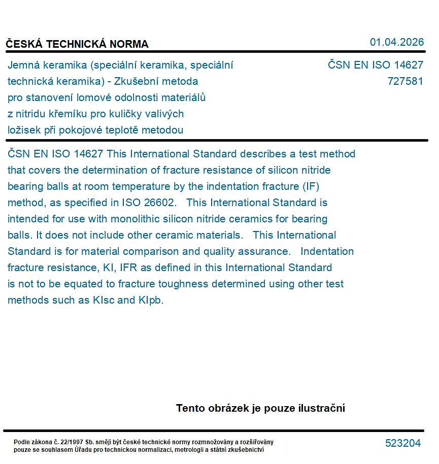 Jemná keramika (speciální keramika, speciální technická keramika) - Zkušební metoda pro stanovení lomové odolnosti materiálů z nitridu křemíku pro kuličky valivých ložisek při pokojové teplotě metodou vtiskového lomu