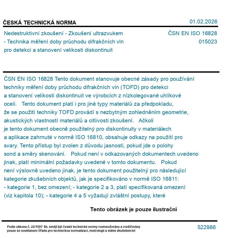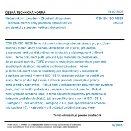 Tento dokument stanovuje obecné zásady pro používání techniky měření doby průchodu difrakčních vln (TOFD) pro detekci a stanovení velikosti diskontinuit ve výrobcích z nízkolegované uhlíkové oceli. Tento dokument platí i pro jiné typy materiálů za předpokladu, že se použití techniky TOFD provádí s nezbytným zohledněním geometrie, akustických vlastností materiálů a citlivosti zkoušení. Ačkoli je tento dokument obecně použitelný pro diskontinuity v materiálech a aplikace zahrnuté v normě ISO 16810, obsahuje odkazy na použití pro svary. Tento přístup byl zvolen z důvodu jasnosti, pokud jde o polohy sond a směry skenování. Pokud není v odkazovaných dokumentech uvedeno jinak, platí minimální požadavky uvedené v tomto dokumentu. Pokud není výslovně uvedeno jinak, je tento dokument použitelný pro následující kategorie zkušebních objektů, jak je specifikováno v normě ISO 16811: - kategorie 1, bez omezení; - kategorie 2 a 3, platí specifikovaná omezení (viz kapitola 10); - kategorie 4 a 5 vyžadují zvláštní postupy, které jsou rovněž uvedeny (viz kapitola 10). POZNÁMKA - Techniky pro použití TOFD pro zkoušení svarů jsou popsány v normě ISO 10863 a související kritéria přípustnosti jsou uvedena v normě ISO 15626.