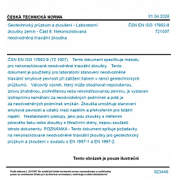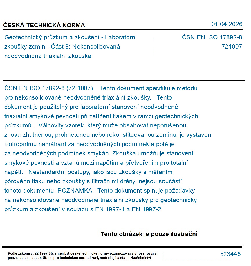 (72 1007) Tento dokument specifikuje metodu pro nekonsolidované neodvodněné triaxiální zkoušky. Tento dokument je použitelný pro laboratorní stanovení neodvodněné triaxiální smykové pevnosti při zatížení tlakem v rámci geotechnických průzkumů. Válcovitý vzorek, který může obsahovat neporušenou, znovu zhutněnou, prohnětenou nebo rekonstituovanou zeminu, je vystaven izotropnímu namáhání za neodvodněných podmínek a poté je za neodvodněných podmínek smýkán. Zkouška umožňuje stanovení smykové pevnosti a vztahů mezi napětím a přetvořením pro totální napětí. Nestandardní postupy, jako jsou zkoušky s měřením pórového tlaku nebo zkoušky s filtračními drény, nejsou součástí tohoto dokumentu. POZNÁMKA - Tento dokument splňuje požadavky na nekonsolidované neodvodněné triaxiální zkoušky pro geotechnický průzkum a zkoušení v souladu s EN 1997-1 a EN 1997-2.