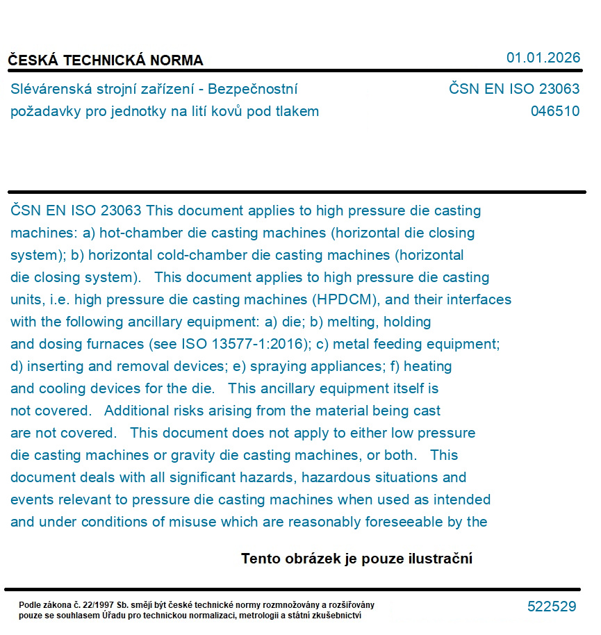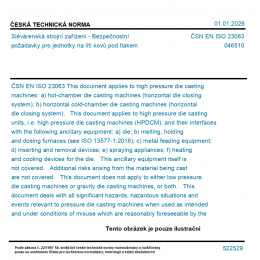 This document applies to high pressure die casting machines: a) hot-chamber die casting machines (horizontal die closing system); b) horizontal cold-chamber die casting machines (horizontal die closing system). This document applies to high pressure die casting units, i.e. high pressure die casting machines (HPDCM), and their interfaces with the following ancillary equipment: a) die; b) melting, holding and dosing furnaces (see ISO 13577-1:2016); c) metal feeding equipment; d) inserting and removal devices; e) spraying appliances; f) heating and cooling devices for the die. This ancillary equipment itself is not covered. Additional risks arising from the material being cast are not covered. This document does not apply to either low pressure die casting machines or gravity die casting machines, or both. This document deals with all significant hazards, hazardous situations and events relevant to pressure die casting machines when used as intended and under conditions of misuse which are reasonably foreseeable by the manufacturer (see Clause 4). This includes hazards coming from intentional interactions as well as unintentional but foreseeable interactions between movable parts of the machine and persons. This document provides the requirements to be met by the manufacturer to ensure the safety of persons and property during transport, commissioning, use, de-commissioning and maintenance periods, as well as in the event of foreseeable failures or malfunctions that can occur in the equipment.