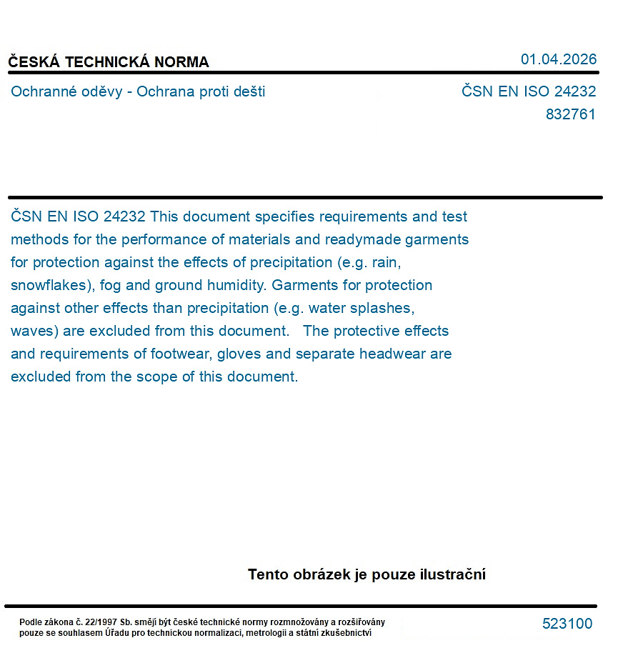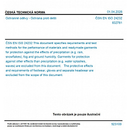 This document specifies requirements and test methods for the performance of materials and readymade garments for protection against the effects of precipitation (e.g. rain, snowflakes), fog and ground humidity. Garments for protection against other effects than precipitation (e.g. water splashes, waves) are excluded from this document. The protective effects and requirements of footwear, gloves and separate headwear are excluded from the scope of this document.