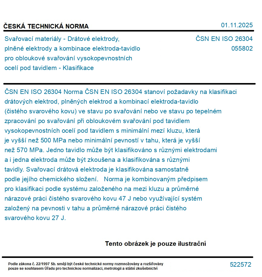 Norma ČSN EN ISO 26304 stanoví požadavky na klasifikaci drátových elektrod, plněných elektrod a kombinací elektroda-tavidlo (čistého svarového kovu) ve stavu po svařování nebo ve stavu po tepelném zpracování po svařování při obloukovém svařování pod tavidlem vysokopevnostních ocelí pod tavidlem s minimální mezí kluzu, která je vyšší než 500 MPa nebo minimální pevností v tahu, která je vyšší než 570 MPa. Jedno tavidlo může být klasifikováno s různými elektrodami a i jedna elektroda může být zkoušena a klasifikována s různými tavidly. Svařovací drátová elektroda je klasifikována samostatně podle jejího chemického složení. Norma je kombinovaným předpisem pro klasifikaci podle systému založeného na mezi kluzu a průměrné nárazové práci čistého svarového kovu 47 J nebo využívající systém založený na pevnosti v tahu a průměrné nárazové práci čistého svarového kovu 27 J.