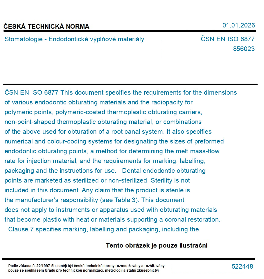 This document specifies the requirements for the dimensions of various endodontic obturating materials and the radiopacity for polymeric points, polymeric-coated thermoplastic obturating carriers, non-point-shaped thermoplastic obturating material, or combinations of the above used for obturation of a root canal system. It also specifies numerical and colour-coding systems for designating the sizes of preformed endodontic obturating points, a method for determining the melt mass-flow rate for injection material, and the requirements for marking, labelling, packaging and the instructions for use. Dental endodontic obturating points are marketed as sterilized or non-sterilized. Sterility is not included in this document. Any claim that the product is sterile is the manufacturer's responsibility (see Table 3). This document does not apply to instruments or apparatus used with obturating materials that become plastic with heat or materials supporting a coronal restoration. Clause 7 specifies marking, labelling and packaging, including the instructions for use. This document does not specify requirements or test methods for sterility. Reference to applicable national regulations, internationally accepted pharmacopoeia and standards for validating sterilization processes can apply.