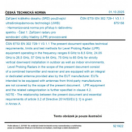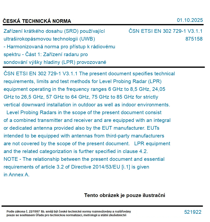 Zařízení krátkého dosahu (SRD) používající ultraširokopásmovou technologii (UWB) - Harmonizovaná norma pro přístup k rádiovému spektru - Část 1: Zařízení radaru pro sondování výšky hladiny (LPR) provozované v kmitočtových rozsazích 6 GHz až 8,5 GHz, 24,05 GHz až 26,5 GHz, 57 GHz až 64 GHz, 75 GHz až 85 GHz výhradně pro vertikální instalaci směrem dolů